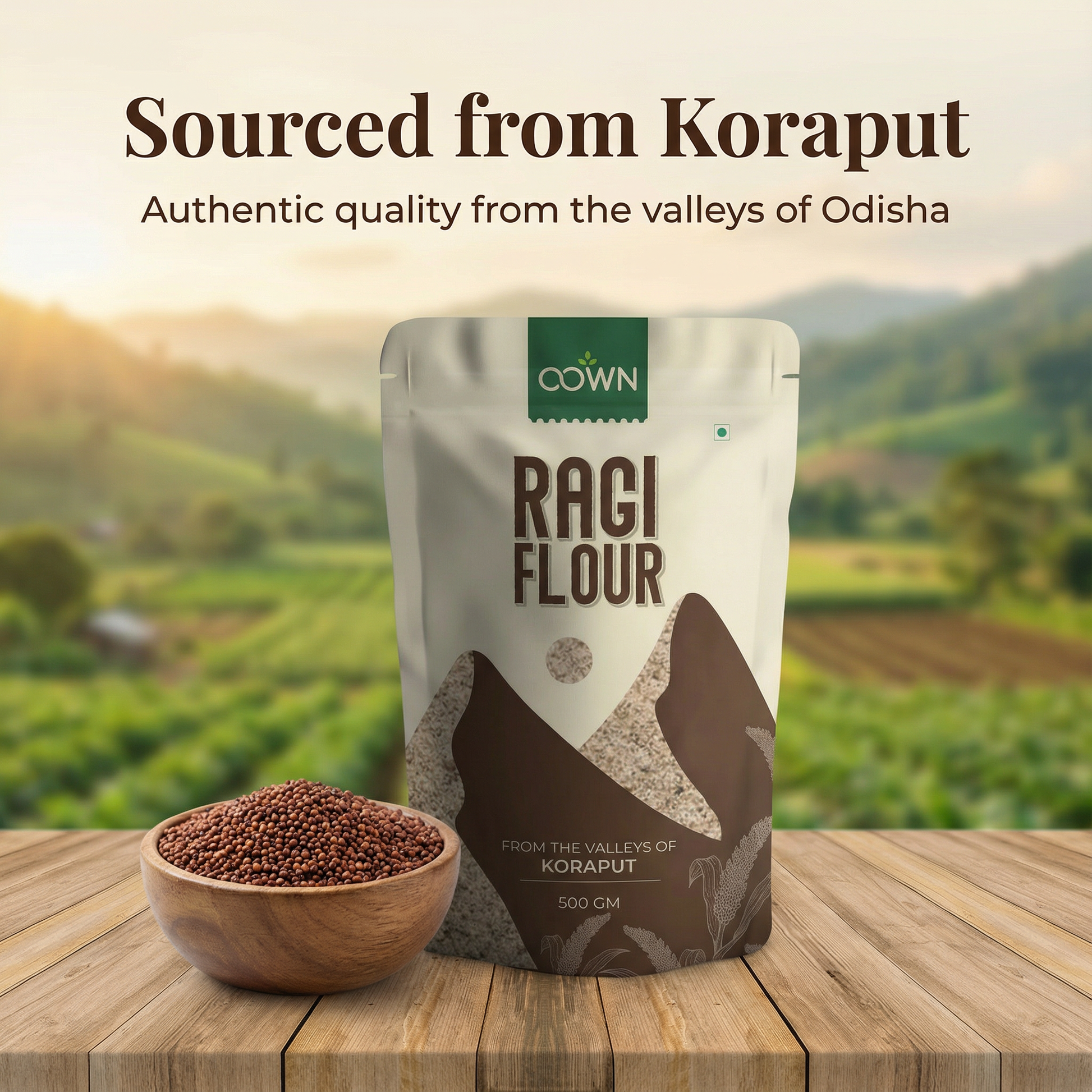 Rooted in tradition and crafted with care, Oown Koraput Ragi Flour is made from naturally grown finger millet sourced from the pristine tribal farmlands of Koraput, Odisha. This ancient grain has been a staple of Indian households for generations, valued for its strength-giving nourishment and wholesome taste.